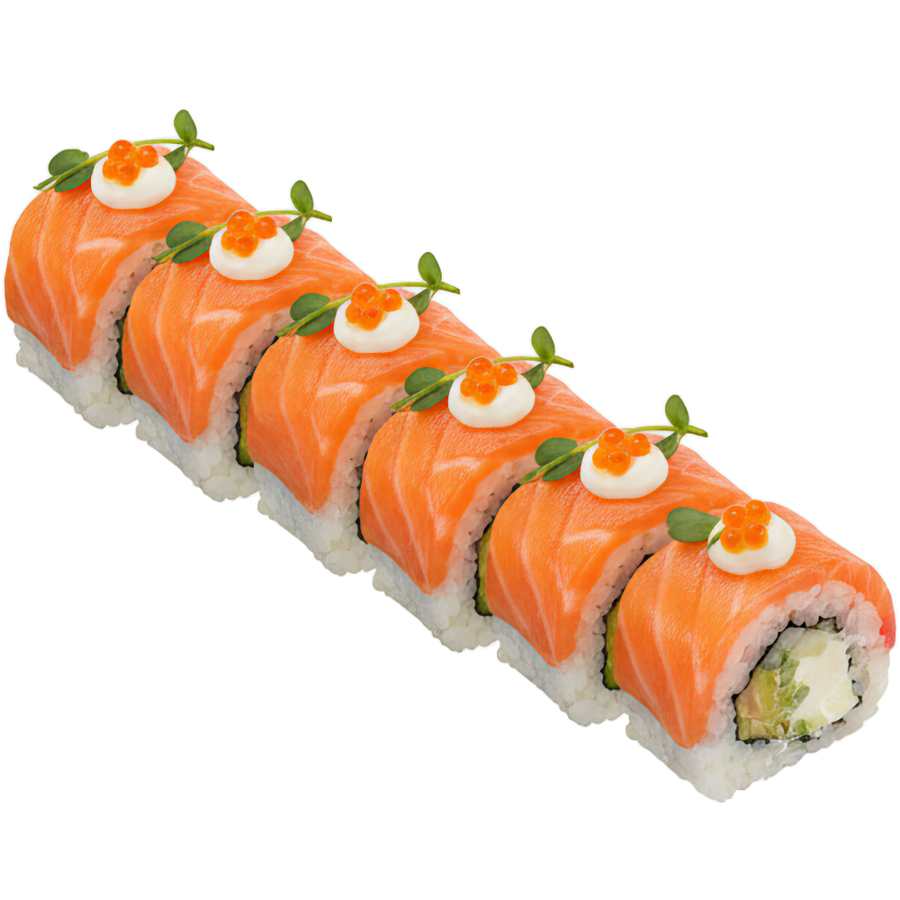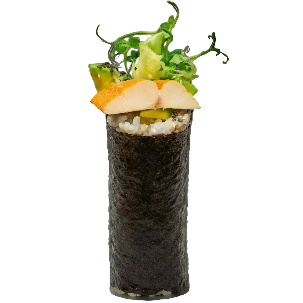 Багатий смак копченого лосося, сиру філадельфія та авокадо з нашими секретними інгредієнтами. Спробуйте, не пошкодуєте!Склад: норі, рис, сир філадельфія, лосось копчений, огірок, авокадо, ікра лососева, мікрогрін + секрет )))